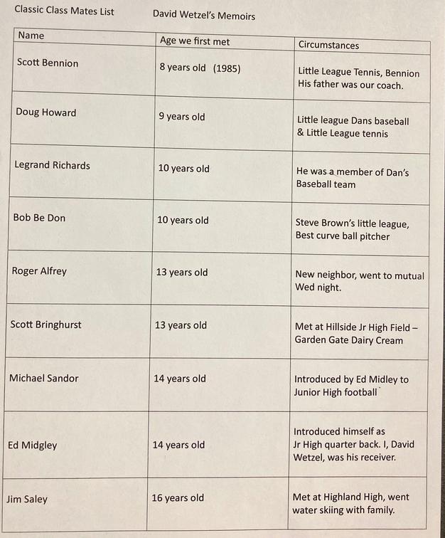 Hey class of ‘66, friends of Dave Wetzel. Dave has asked me to share with you that he is ill; been diagnosed with lymphoma sarcoma cancer. He is in St. Marks Hospital and is having chemotherapy treatments. Dave put together the attached chart and wanted me to share it with you. He’s been reminiscing about old times and some good friends. Prayers with you, Dave!